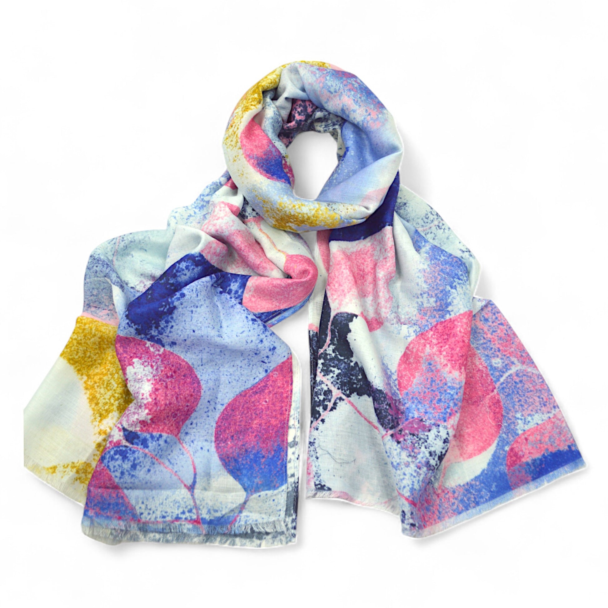 Add a burst of colour to your wardrobe with this fusion of abstract art on a lightweight scarf